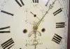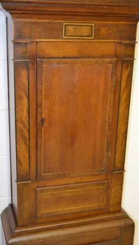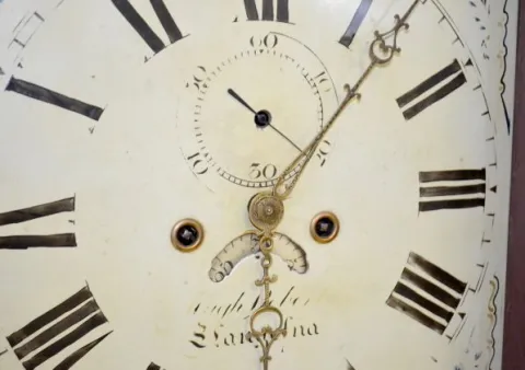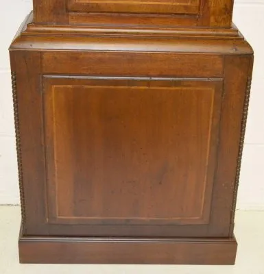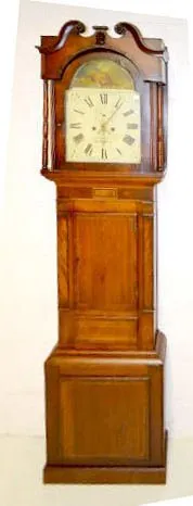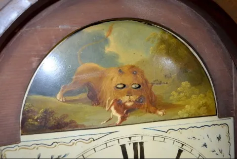 English Calendar Grandfather Clock, Animated In a mahogany case with a signed metal dial with seconds bit, a male lion with animated eyes and dead deer. (There is some roughness to the case.) 86" Tall Not tested.