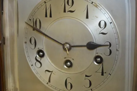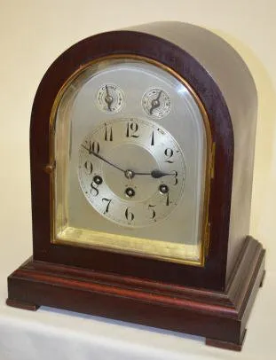 Antique German Westminster Chime Short Clock Mahogany case; nice dial; beveled glass.
