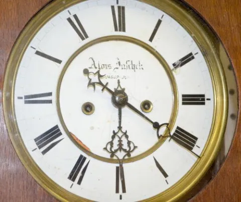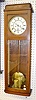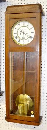 Signed Two-Weight Vienna Wall Clock Brass trim; mahogany case; porcelain dial. 35ÓT (Signature is illegible, case has scuffs, dial is damaged, weights have dents.)