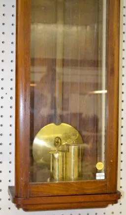 Brass trim; mahogany case; porcelain dial. 35ÓT (Signature is illegible, case has scuffs, dial is damaged, weights have dents.)