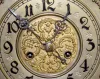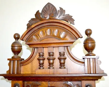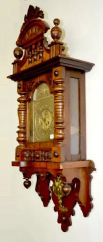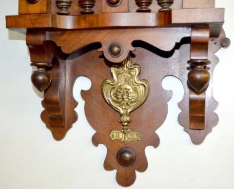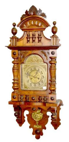 Ornate German Free Swinger Wall Clock Ornate brass dial and pendulum; T&S. 38ÓT (Wood split on top side of door.)