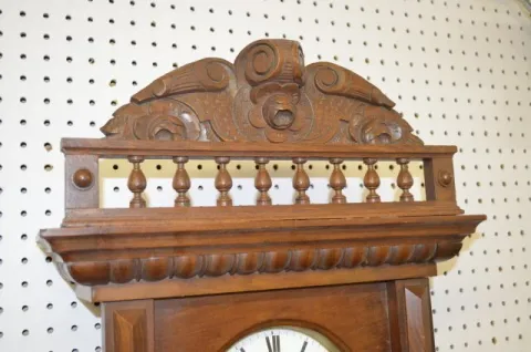 Carved case, brass trim, porcelain dial. 48ÓT (Weights dented and touched up.)