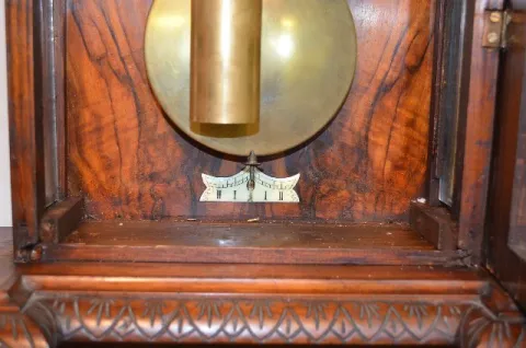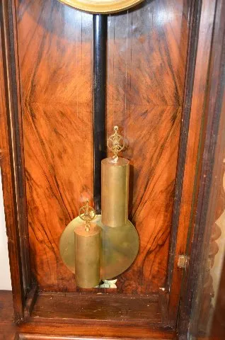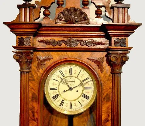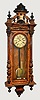 Ornate Two-Weight Vienna Regulator Wall Clock Burled and carved case; ornate two-piece porcelain dial; 2 seconds bit. 55ÒT (Very nice, minor scuffs.)