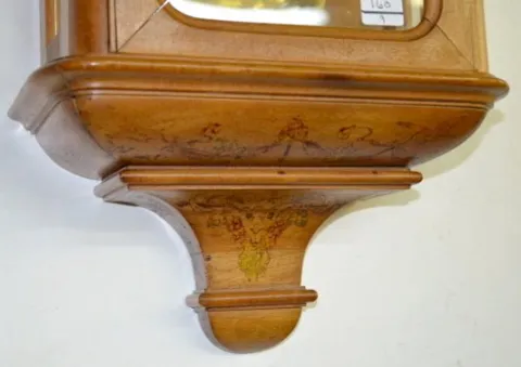 1 Wt. Miniature Vienna Regulator Clock In a nice case with a TO movement; a porcelain dial, the weight and the pendulum. (The dial is cracked.) 27Ò Tall x 9 1/2Ó Wide x 4Ò Deep Not tested.