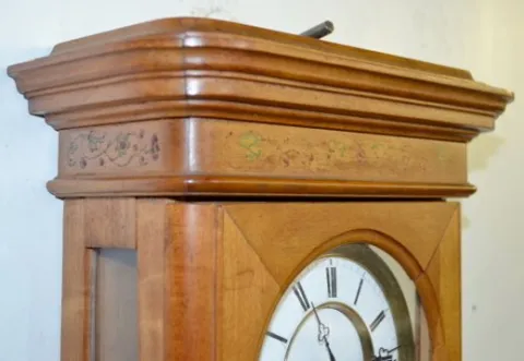 In a nice case with a TO movement; a porcelain dial, the weight and the pendulum. (The dial is cracked.) 27Ò Tall x 9 1/2Ó Wide x 4Ò Deep Not tested.