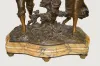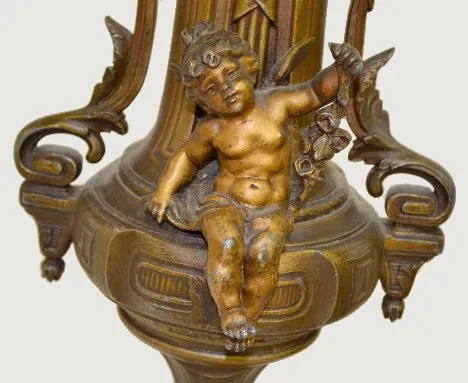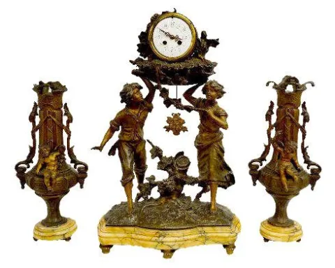 L & F Moreau Marble Garniture Set With a T&S movement numbered 6538; an unmarked porcelain dial; and the pendulum. The statue is signed ÒL & F MoreauÓ and depicts a young girl and boy carrying a basket. The side pieces are tall metal vases with Putti. (The clock is not running at this time.) (One of the metal side pieces is damaged at the top - the points are all broken off.) The clock is 26Ò Tall; the side pieces are 18Ó Tall Not tested.
