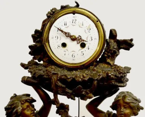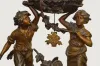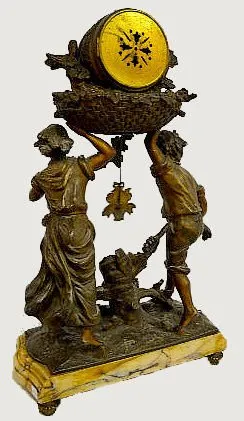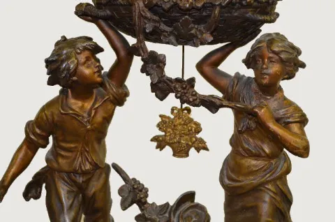 With a T&S movement numbered 6538; an unmarked porcelain dial; and the pendulum. The statue is signed ÒL & F MoreauÓ and depicts a young girl and boy carrying a basket. The side pieces are tall metal vases with Putti. (The clock is not running at this time.) (One of the metal side pieces is damaged at the top - the points are all broken off.) The clock is 26Ò Tall; the side pieces are 18Ó Tall Not tested.