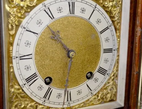 Lenzkirch Quarter Hour Strike Clock Fancy dial; lots of brass trim. (Case has a few marks.)