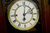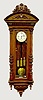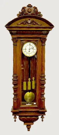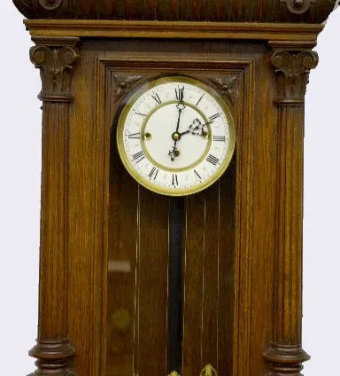 Large Grand Sonnerie Vienna Wall Clock Oak carved, 3 weight, 2 piece porcelain dial; brass trim and weights. 64ÓT Not tested.