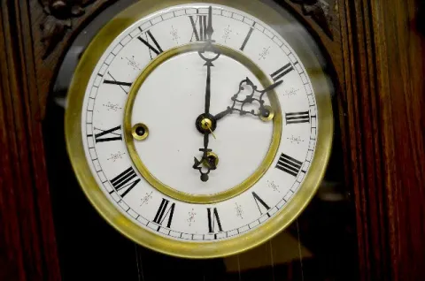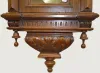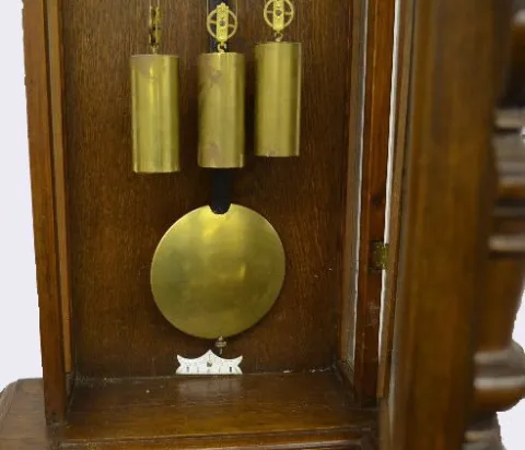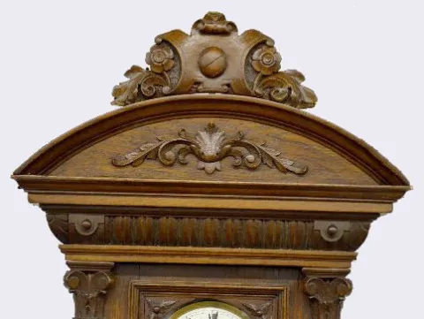 Oak carved, 3 weight, 2 piece porcelain dial; brass trim and weights. 64ÓT Not tested.
