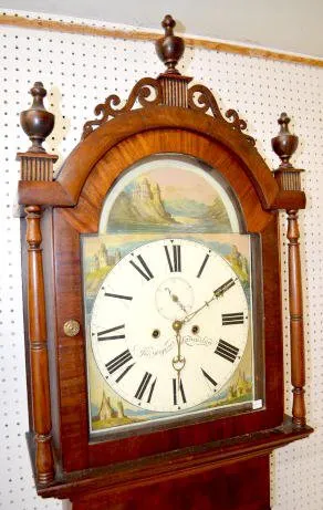 English T&S 8 Day Tall Case Clock Great painted dials ÓJNO Higgins LancashireÒ; mahogany veneer. 8ÕT