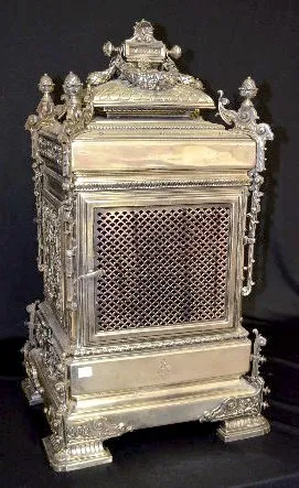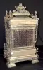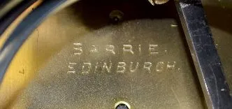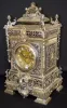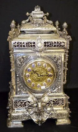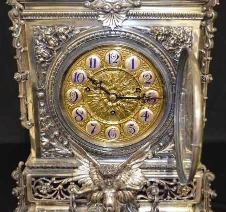 all metal with painted cartouche numerals; ornate case with garlands, acorns, scrolls and a full figure winged cherub; movement signed Barrie, Edinburgh (1840-1907); silverplate case stamped with English Registry mark dated Aug. 20, 1883. 28Ó T x 15Ò W x 13Ó D (The clock runs but the movement needs to be cleaned.)