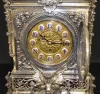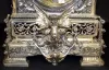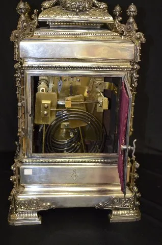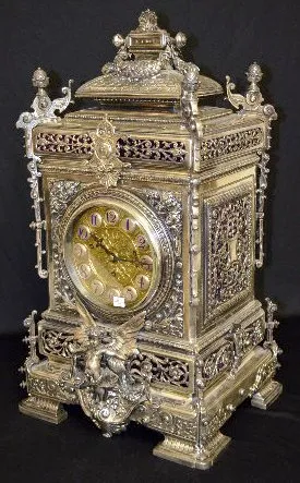 Massive English 8 Bell Bracket Clock w/Cherub all metal with painted cartouche numerals; ornate case with garlands, acorns, scrolls and a full figure winged cherub; movement signed Barrie, Edinburgh (1840-1907); silverplate case stamped with English Registry mark dated Aug. 20, 1883. 28Ó T x 15Ò W x 13Ó D (The clock runs but the movement needs to be cleaned.)