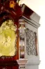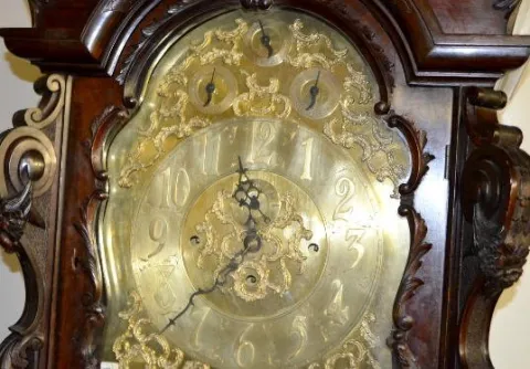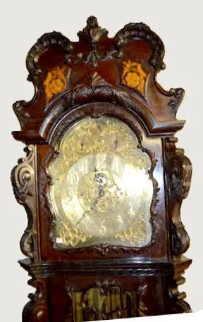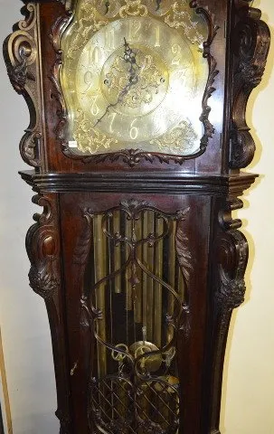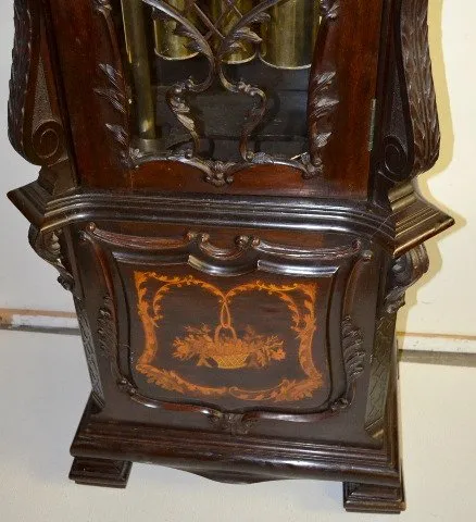Pictured in book; mahogany case; heavily carved; Marqueterie Inlay fret work over glass; 3 weight tube chime; Westminster- Whittington chimes; heavy ornate brass dial. 8ÕT (The strike rod needs to be adjusted.)
