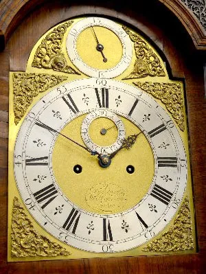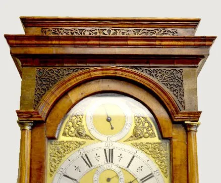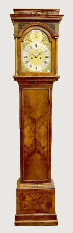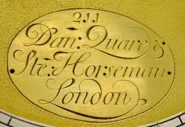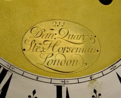 Dan Quare London C. 1715 English Tall Case Clock 1715 English Tall Case Clock: Exotic English burl case; calendar and seconds bit; brass and nickel dial with ÒStephen HorsemanÓ . (Some cracked veneer.)