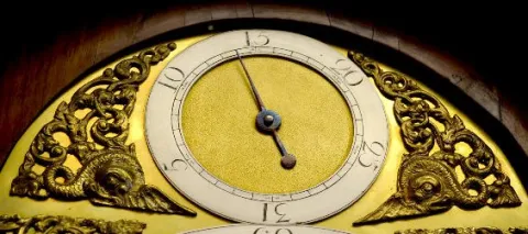 1715 English Tall Case Clock: Exotic English burl case; calendar and seconds bit; brass and nickel dial with ÒStephen HorsemanÓ . (Some cracked veneer.)