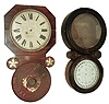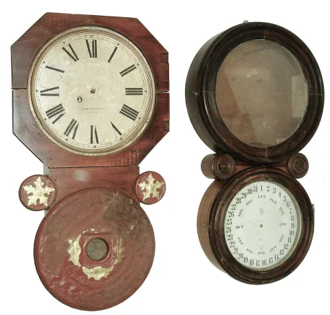 Clocks- 2 (Two): (1) Baird Clock Co., Plattsburgh, NY, Advertising Clock, 8 days, time only, movement in a wall hanging case, c1890. (2) E. Ingraham & Co., Bristol, Conn.ÓIonic CalendarÒ rosewood case (only), c1886 (1) The movement is signed ÓSeth Thomas Clock Co. for Edward P. Baird & Co., New York & MontrealÒ. The model is unidentified. The upper door is missing. The lower one has been damaged by Ózip stripÒ which melts the composition. A plus is the dial which is in better condition than most. Ht 29Ó. (2) Included here is an E. Ingraham case, a new Ithaca Calendar Clock Co. dial and a B. B. Lewis Perpetual Calendar ÒYÓ mechanism. Ht 29 1/2Ò.