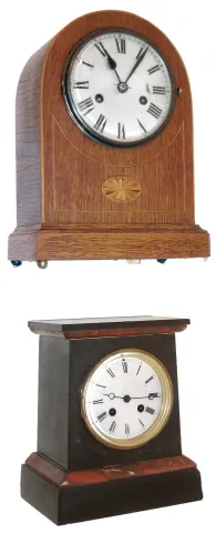 Clocks- 2 (Two) European Shelf Clocks: (1) French marble (red and black) shelf clock with spring driven, 8 days, time and strike, round movement, c1890; (2) German round top wood cased shelf clock with spring driven, 8 days, time and strike, movement, c1900; (1) The are some chips to the marble case. The finish has oxidized. The porcelain dial and hands are original and in excellent condition. Ht 8 3/4Ó. (2) The wood case retains some original finish and has nice inlay on the case front. The hands and dial are original and in good condition. There is one age crack in the veneer on the top of the case. 3 of the 4 small round feet are missing. Ht 12Ò.