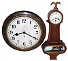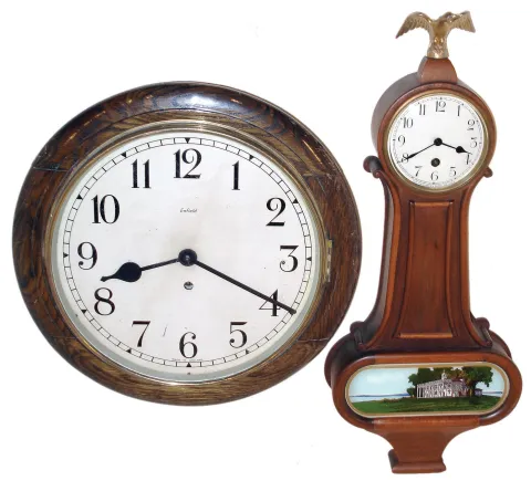 Clocks- 2 (Two), 8 days, time only, wall clocks: New Haven ÓWaylandÒ mahogany banjo balance wheel wall clock, c1923; Smiths Enfield English oak dial pendulum clock, c1910 the banjoÕs solid wood shaped case has been nicely refinished. Its white enameled dial and lower glass tablet are fine. The English dial has a glossy finish with some worn areas. Its painted metal dial has minor scratches. Both movements tick but sold as is. Hts 24Ó and 16Ò
