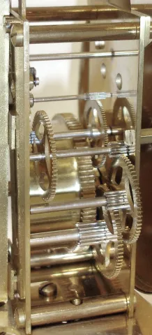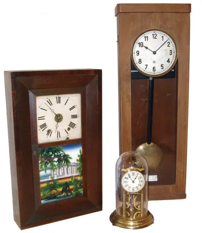 (1) Brass case in nice condition. Porcelain dial is fine with a dome. (2) Mahogany veneered case in original finish with some slight veneer damage in the upper right corner. Original painted dial with slight wear. Original tablet with some loss. Original hands. Nice label inside the case. (3) Case looks to be some type of oak, needs finish, with some veneer damage on the bottom. Silvered dial with some staining. Original hands and pendulum.