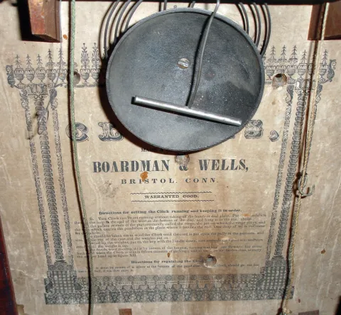 Clocks- 3 (Three): (1) German, 400-day or rotary pendulum mantel clock. (2) Boardman & Wells, Bristol, Conn., 30 hours, time, strike and alarm, weight wood movement bevel case shelf clock, c145. (3) European (German?), electric wall regulator. Dial marked ÒNTÓ. (1) Brass case in nice condition. Porcelain dial is fine with a dome. (2) Mahogany veneered case in original finish with some slight veneer damage in the upper right corner. Original painted dial with slight wear. Original tablet with some loss. Original hands. Nice label inside the case. (3) Case looks to be some type of oak, needs finish, with some veneer damage on the bottom. Silvered dial with some staining. Original hands and pendulum.