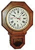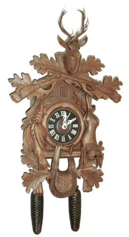 (1) this school clock has been heavily restored with refinished case, new paper dial, gold-painted bezel ring, new lower glass, and movement mounted on spacers so the hand shafts project adequately through the dial. Movement ticks but not tested long term. Ht 25Ò (2) this modern cuckoo is in very good original condition with no damage or losses. The signed movement, with functioning bellows, operates correctly but was not tested long term. The pendulum, not wood but a cast composition material, may be later. Ht from antler tops to case bottom is 23Ó