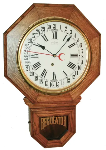 Clocks- 2 (Two) wall clocks: (1) E. Ingraham, Bristol, Conn., 8 days, oak time and calendar short-drop octagon, c1910; (2) German 2-weight, 8 days, carved wood cuckoo clock, Regular 34 movement for E. Schmeckenbecher, dated 1972 (1) this school clock has been heavily restored with refinished case, new paper dial, gold-painted bezel ring, new lower glass, and movement mounted on spacers so the hand shafts project adequately through the dial. Movement ticks but not tested long term. Ht 25Ò (2) this modern cuckoo is in very good original condition with no damage or losses. The signed movement, with functioning bellows, operates correctly but was not tested long term. The pendulum, not wood but a cast composition material, may be later. Ht from antler tops to case bottom is 23Ó