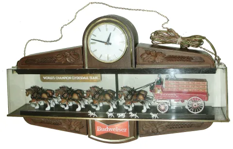 Budweiser plastic plug-in electric hanging advertising clock with ÒWorld Champion Clydesdale TeamÓ horse, dog, and carriage figures, mid 20th century