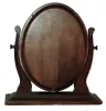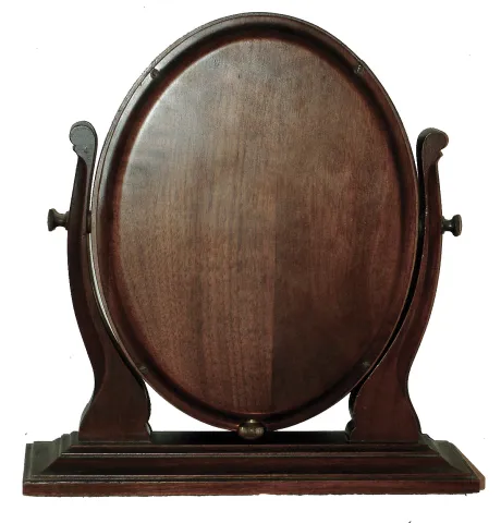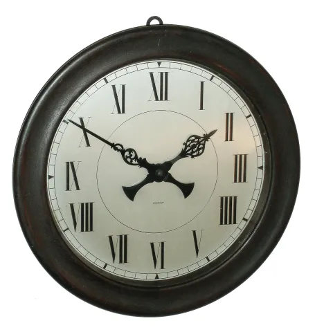 Clocks- 2 (Two) Waltham, c1925: (1), 8 days, walnut, time only, library clock; (2) round mahogany, 8 days, time only, gallery clock (1) the wood surface has a nice soft patina and perhaps was refinished. There is a slight shrinkage split at the bottom of the wood bezel. The stylish silvered dial, with oversize Roman numerals, is very nice. The clock winds and sets, but was not tested long term, and the wind/set positions as the stem is pulled out may need adjustment. Ht 11Ó (2) the original finish has darkened but the case overall is in very nice condition. The wood is slightly chipped by the winder. The signed silvered dial has just a few small tarnish spots. The movement winds and sets but does not tick, so service will be needed. Diameter overall is 13Ò, dial diameter 10Ó