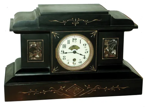 the heavy stone case is in very nice condition except for tiny corner chips. The front multi-color marble inserts, and the bold two-color incised scrolls, add to the appeal. The porcelain dial is fine, as is the beveled glass. The movement winds, ticks and strikes, with the balance wheel visible threw out the curved dial aperture. Ht 10 1/2Ó