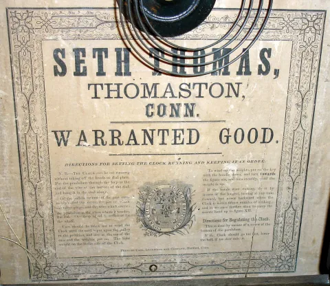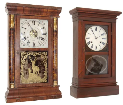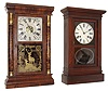 Clocks- 2 (Two) Conn. weight shelf clocks: (1) Waterbury Clock Co., Waterbury, Conn.ÓParlorÒ clock in a rosewood case with a weight driven, 30 hours, time & strike movement, c1870. (2) Seth Thomas Clock Co., Thomaston, Conn., ÓColumnÒ clock in a rosewood case with a weight driven, 30 hours, time & strike movement, c1870. (1) The case retains its original finish, which has darkened. There is some veneer bubbling along the base. The painted dial is original with some loss at the screw holes. The hands are original as are the upper and lower glasses. The movement is signed. There is no pendulum bob. Ht 25 1/2Ó. (2) The case still has original finish. There are veneer chips in several locations. The painted dial is original with minor loss at the pin clamps and some minor flaking. The hands are period and may be original. The movement is signed. The label is excellent. The upper door glass is original and the lower stenciled tablet is very good although the black backing has significantly flaked. Ht 25Ò