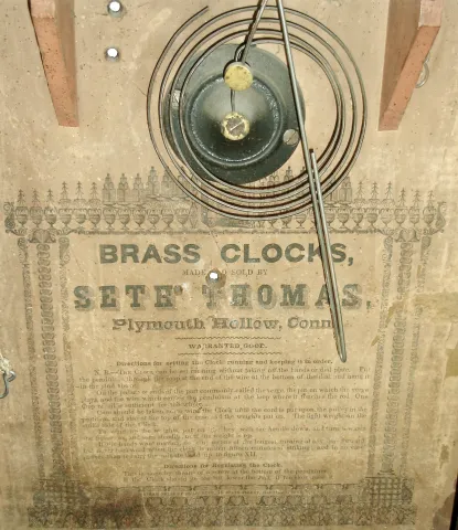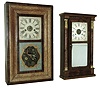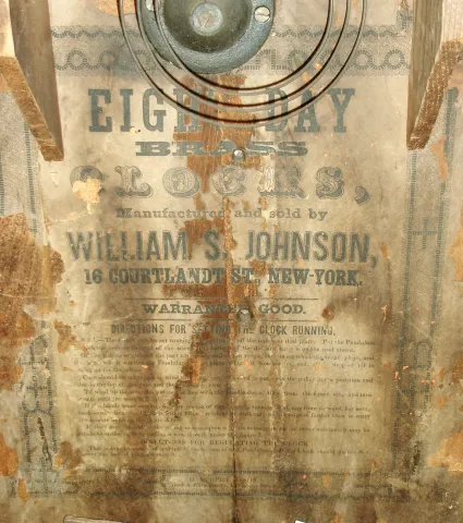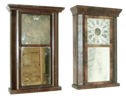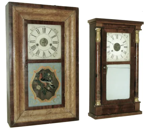 Clocks- 4 (Four): (1) Atkins, Porter & Co., Bristol, Conn., 30 hours, time and strike, weight driven, brass movement in a reverse OG case with cornice molding in rosewood veneer, c144, (2) William S. Johnson, 16 Courtlandt St., New York, 8 days, time and strike, weight driven, brass movement by Forestville Mfg. Co., (Bristol) in an OG case with mahogany and birds eye maple veneer, c146. (3) Seth Thomas Clock Co., Plymouth Hollow, Conn., mahogany ÒShell columnÓ model, 30 hours, time and strike, weight driven, brass movement with faux tortise shell half columns with gilt caps, c1855. (4) Unknown (possibly Jerome) round sided case with an Atkins and Porter, 30 hours, time and strike, weight driven, brass movement, (1) The mahogany veneer retains some original finish with wear and some veneer repairs to the door. The hands, striking gong and weights are missing. The painted metal dial has significant loss, The upper door glass is original. The door mirror, while old, may replaced. Ht 23 1/2Ò. (2) There is some original finish. The movement is signed but it and the dial may not be original to this case, The painted wood dial is in good condition. The movement is missing the striking hammer as well as hands and pendulum. The lower glass is a Fenn glass in nice condition. Ht 28Ó. (3) The finish is rough and worn. The painted dial is in good condition and the hands are original. The half columns are now detached and stored inside the case. The door glass and mirror are both old and may be original to the case. There are no weights Ht 26Ò (4) Only the case and movement are included. There are no hands, dial, pendulum bob, gong, movement mounting bracket, weights or label. Ht 22 1/4Ó