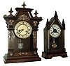 Clocks- 2 (Two): (1) Junghans Clock Co., Steeple clock with a, 30 hours, time & alarm movement in a wood case with burl decorations, c1900. (2) German shelf clock with spring driven, 8 days, time & strike movement in wood case with brass embellishments, c1920. (1) The clock has a nice original finish. The painted dial has minor loss. The hands are original, as is the door glass. Ht 17Ó (2) The case retains a nice original finish. The hands and dial are in nice condition. The bottom of the case shows evidence that there may have been small wooden feet, now missing. Ht 18 1/2Ò.