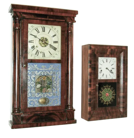 (1) The mahogany case has some original finish but there appears to be additional stain applied over the finish. There are small areas of veneer damage in several locations. The hands are replacements. The painted dial has darkened with age and there is paint loss at the winding holes and screw holes. The movement was likely signed but the letters have been stamped out and are not readable. The tablet and upper door glass are original. Ht 26Ó. (2) The finish has been rubbed off. The painted dial has minimal loss at the screw holes. The hands, tablet and upper door glass are original with some loss to the tablet. Ht 18 1/2Ò.