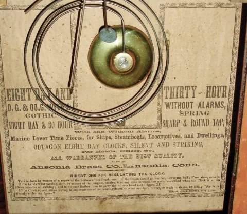 Clocks- 2 (Two): (1) Seth Thomas Clock Co. Plymouth Hollow, CT and retailed by R. W. Patterson & Co., Toronto, Canada West., 30 hours, weight driven, time, strike and alarm movement ÓRose ColumnÒ model in a mahogany case, c1855. (2) Ansonia Brass Co.,