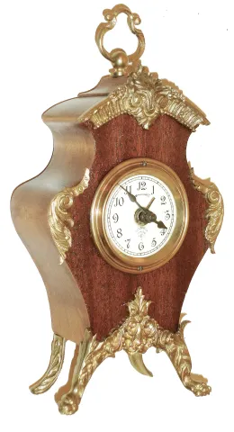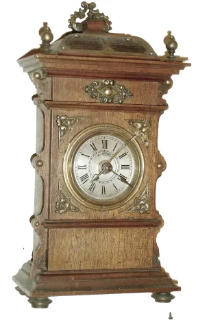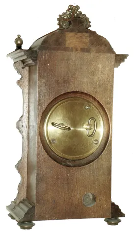 Clocks- 2 (Two): Lenzirch, Germany, walnut with brass trim, 30 hours, alarm clock, c1890 these clocks are part of the large Lenzkirch collection offered in this sale. (1) The finish has been rubbed out to a nice patina, and the silvered dial looks good. There never was a front bezel and glass. The movement ticks and stops. Ht 10Ó (2) the ornate case and bracket have a soft patina with some minor scratches. The silvered dial, with fancy brass center, possibly was refinished. The thick beveled glass is fine. The signed and numbered movement ticks and strikes. There are two mount holes in the case top, but no sign of any top crest of finials. The gong stand is present but needs to be reattached to the case bottom (removed for shipment). Ht on bracket 20 1/2Ò