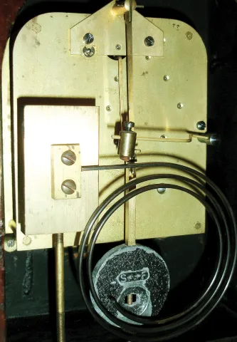 the case has an old glossy finish with no losses or damage, and retains its brass top handle. The brass dial has fancy cast-brass corner spandrels, and its silvered chapter ring has slight tarnish and minor wear at the bottom. The signed movement, No. E5958, ticks and strikes on a gong. Ht 12 1/4Ò