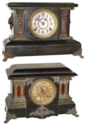 both ornate cases, with simulated green marble, are in good original condition with no damage or losses. Rear paper labels are present, although one is quite worn, and there is a dealer sticker from Gardiner, ME. The movements are complete but were not tested. Sold as is, no further information available. Hts 11Ó