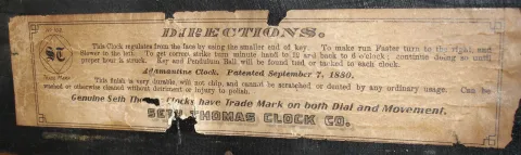 Clocks- 2 (Two) Seth Thomas Black and Green Adamantine, 8 days, time and strike, wood mantel clocks, both c1895 both ornate cases, with simulated green marble, are in good original condition with no damage or losses. Rear paper labels are present, although one is quite worn, and there is a dealer sticker from Gardiner, ME. The movements are complete but were not tested. Sold as is, no further information available. Hts 11Ó