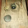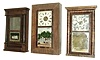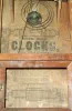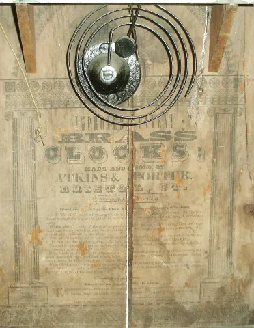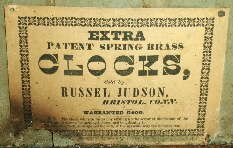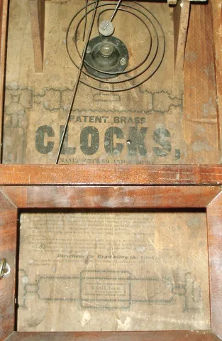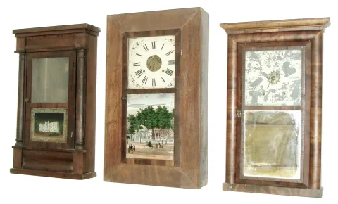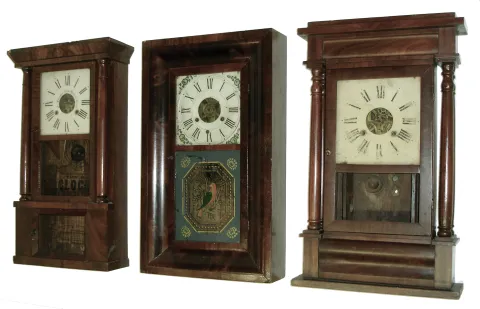(1) J. M. Patterson. Empty case with original tablet with minor loss. No dial, weights, pendulum or movement. Clean label. (2) Russell Judson. Replaced dial in poor condition. Minute hand missing. Nice card label inside case; (3) Atkins & Porter, alarm movement between the plates missing. Hands missing. No weights. Original dial with some loss. Original Fenn tablet with some background loss. (4) Unknown, Original wood dial with loss. No hands, weights, pendulum, or gong. Tablet and label are missing. (5) Chauncey Jerome. Original wood dial with some loss. Tablets are missing. No hands or pendulum. One weight missing. (6) Jerome & Co. Flat front molding later addition. Wood dial looks to be original with grommets missing. Original tablet in the door. Minute hand is a replacement. No weights or pendulum.