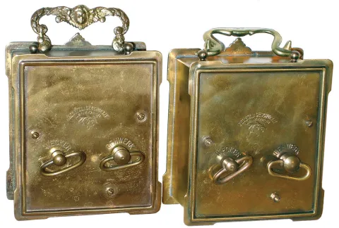 Clocks- 2 (Two) Lenkirch German small brass 30-hour carriage-style alarm clocks, c1890