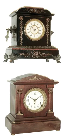 Clocks- 2 (Two): (1) Ansonia Clock Co., Ansonia, Conn., 8 days, time and strike, spring brass movement iron case black mantel clock, c185. This example is the same as the ÒSt. ClairÓ model with different side ornaments. (2) Seth Thomas Clock Co., Thomaston Conn., ÒBerkleyÓ, 8 days, time and strike, spring brass movement mantel clock, c1908. (1) Enameled iron case with marbleized accents in original finish with minor paint loss on the top front edge. Original paper dial is in nice condition for its age. Original hands. (2) Mahogany case in original finish with what looks to be worn spots on the lower left corner. Original porcelain dial with minor stains at the winding arbors. Original hands