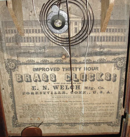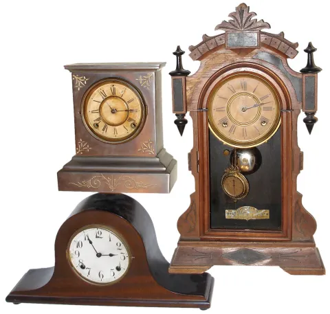 Clocks- 5 (Five) Connecticut, time and strike, mantel and shelf clocks: E.N. Welch Mfg. Co. and Chauncey Jerome, 30 hours, weight-driven OGÕs; tambour; Ansonia ÒSydneyÓ model walnut parlor with fancy pendulum, c186; and Ansonia ÒUniqueÓ iron with black