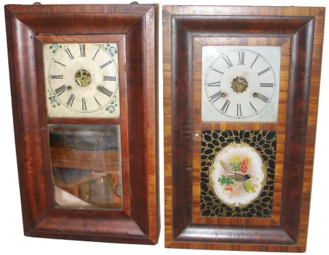 assortment of clocks for restoration or parts. The OGÕs need hands and weights, and the parlor and tambour clocks need glasses. The heavy iron mantel clock looks interesting with its paint removed, but is not original. Sold as is, no further details available.