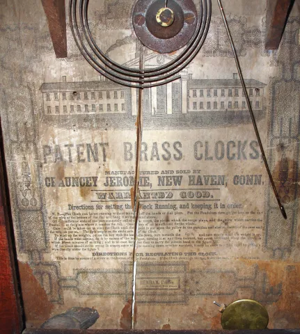Clocks- 5 (Five) Connecticut, time and strike, mantel and shelf clocks: E.N. Welch Mfg. Co. and Chauncey Jerome, 30 hours, weight-driven OGÕs; tambour; Ansonia ÒSydneyÓ model walnut parlor with fancy pendulum, c186; and Ansonia ÒUniqueÓ iron with black paint removed; late 19th and early 20th centuries assortment of clocks for restoration or parts. The OGÕs need hands and weights, and the parlor and tambour clocks need glasses. The heavy iron mantel clock looks interesting with its paint removed, but is not original. Sold as is, no further details available.