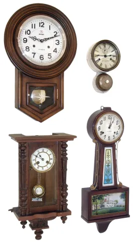 Clocks- 4 (Four): (1) Small German wall clock with spring driven, 8 days, time and strike, movement, c1900. (2) Seth Thomas Clock Co., Thomaston, Conn.shipÕs bell wall clock with 30 hours, time and ships bell strike, c1880; (3) Korean small schoolhouse wall clock in a wooden case with 31 day, spring driven, time and strike, movement, c1980. (4) New Haven Clock Co., New Haven, Conn., ÓWhitneyÒ, 8 days, time, hour and half-hour strike Banjo shelf clock c1930. (1) The finish is rough, The porcelain dial and R-A pendulum bob are in good condition. Ht 21Ó. (2) The clock case has been painted white. The bezel may be from a similar clock. Ht 10 1/2Ò. (3) The clock appears to be in good condition overall. Ht 22Ó. (4) The best of the four clocks ... nice finish, dial, hands, label and pendulum bob, but finial is missing. Ht 27Ò.