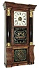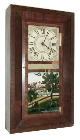 (1) Refinished rosewood veneered case with some loss on the base. The original dial has been nicely repainted. Replaced hands of the proper type. The columns have been restored, but it looks like they used imitation gold leaf to regild the capitals and bases that did not turn out well. Nice Fenn tablet in the bottom door and original decalcomania tablet in upper door. Movement is signed. Nice label inside the case. Ht 32 1/2Ò (2) Mahogany veneered case with some loss and repairs on the outer banding and the door. Original painted dial with some loss and wear. Original hands. Original tablet with loss. Nice label inside the case. Ht 26 1/2Ó