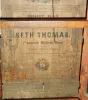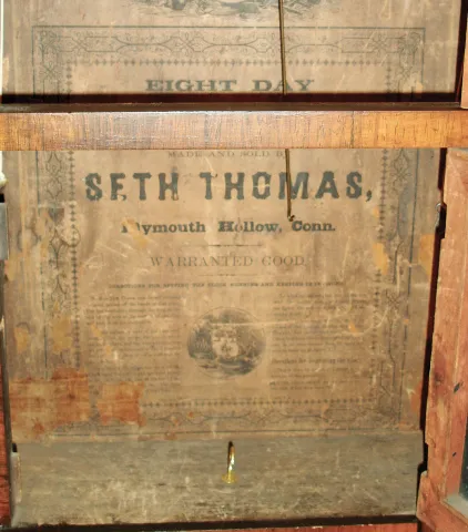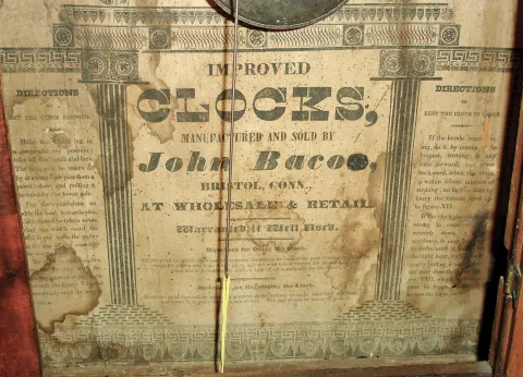 Clocks- 2 (Two) American Shelf: (1) Seth Thomas Clock Co., Plymouth Hollow, Conn., 8 days, time and strike, weight brass movement column & cornice shelf clock, c1862 (2) John Bacon, Bristol, Conn., 30 hours, time and strike, weight wood movement bevel front shelf clock, c1835 (1) Refinished rosewood veneered case with some loss on the base. The original dial has been nicely repainted. Replaced hands of the proper type. The columns have been restored, but it looks like they used imitation gold leaf to regild the capitals and bases that did not turn out well. Nice Fenn tablet in the bottom door and original decalcomania tablet in upper door. Movement is signed. Nice label inside the case. Ht 32 1/2Ò (2) Mahogany veneered case with some loss and repairs on the outer banding and the door. Original painted dial with some loss and wear. Original hands. Original tablet with loss. Nice label inside the case. Ht 26 1/2Ó