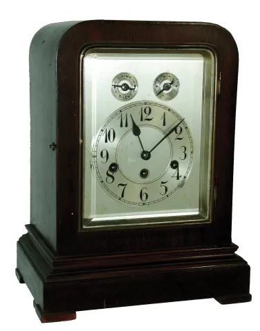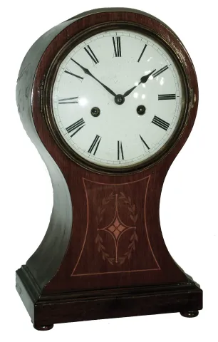 Clocks- 2 (Two): (1) Junghans, Germany, mahogany, 8 days, Westminster chime bracket clock, c1910; (2) Hamburg American Clock Co., Germany,. mahogany, 8 days, time and strike, inlaid balloon-case mantel clock, c1910 (1) the original surface has minor dings and scratches but no major damage. The silvered dial has just small tarnish areas, and thick beveled glass is okay. The B20 movement ticks and chimes but was not tested long term. Ht 13 3/4Ó (2)