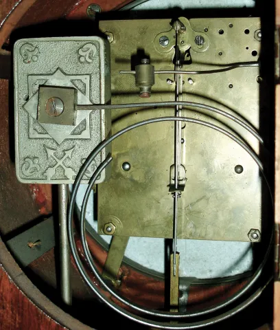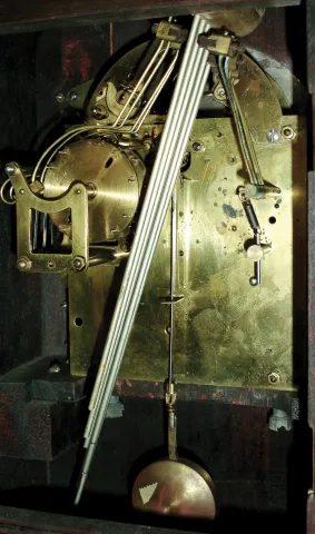 (1) the original surface has minor dings and scratches but no major damage. The silvered dial has just small tarnish areas, and thick beveled glass is okay. The B20 movement ticks and chimes but was not tested long term. Ht 13 3/4Ó (2)